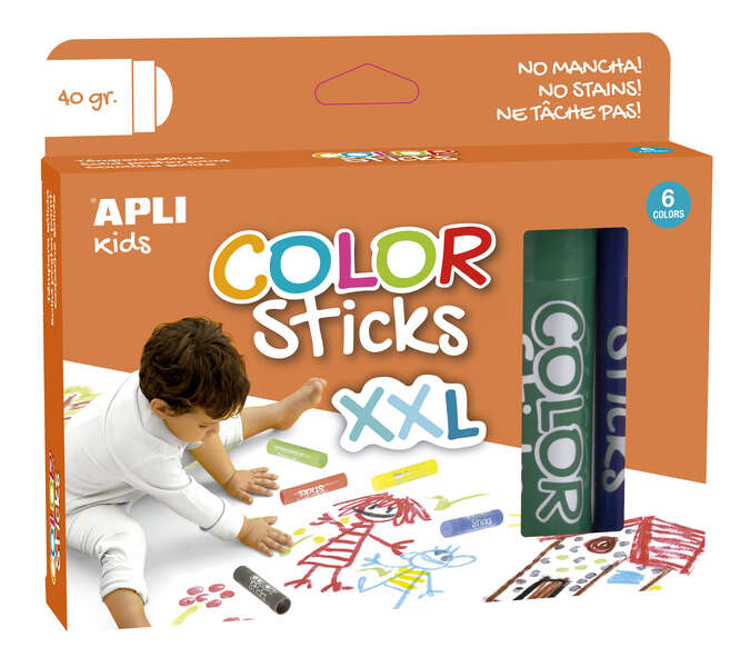 Apli Color Sticks xxl Temperas Solidas – Pack 6 Unidades de 40g – Tamaño xxl para Murales – Acabado Satinado sin Necesidad de Barniz – Secado Rapido en Menos de 3 Minutos – Efecto Cera o Tempera Segun la Presion