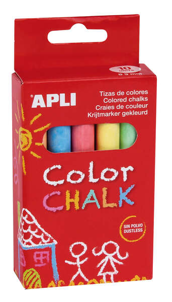 Apli Tizas Redondas de Colores Surtidos – Pack de 10 Tizas de Ø 9 x 80mm – sin Polvo – Ideales para Escribir, Dibujar y Colorear en Pizarras y Pavimentos – Aptas para Uso Escolar