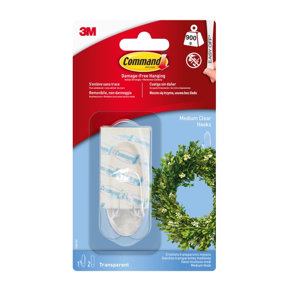 Command Gancho Mediano – 2 Tiras Adhesivas – Soporta hasta 0.9kg – Color Transparente