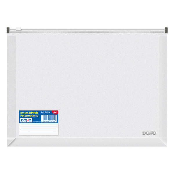 Dohe Bolsa Zipper Apaisada de Polipropileno Transparente – 180 Micras – Cierre Zip Hermetico Blanco – Lomo Expansible 30mm – Etiqueta Frontal