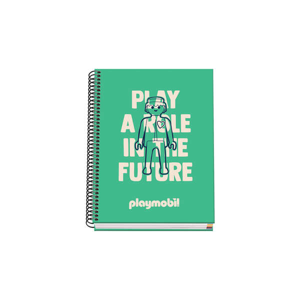 Cuaderno en espiral de tapa dura tamaño A5 ( 162 x 210 mm. Cubierta en cartón forrado con papel impreso a todo color y plastificado brillo. Guardas impresas. Cuaderno con espiral metálico color Negro. Interior de 100 hojas en papel offset de 90 gramos microperforadas, con taladros y cuadrícula de 5 mm con banda de color. Con certificado FSC Mixto