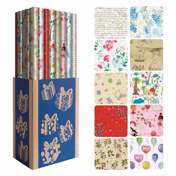 Dohe Everyday Expositor de 50 Rollos de Papel Regalo – 10 Diseños Diferentes – 5 Rollos por Diseño – Medidas del Rollo 0.70x2m