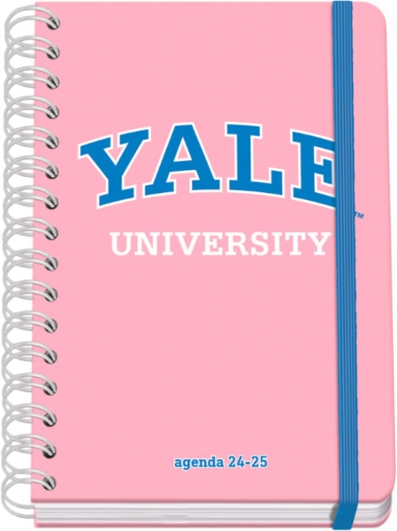 Dohe YALE Pink Lady Agenda escolar semana vista. Todos los días de la semana en dos hojas. La cubierta está fabricada en cartón forrado con papel impreso a todo color y plastificado brillo con puntas redondeadas. Guardas impresas. Una agenda con wire’o metálico de color blanco y cierre con goma elástica plana en color azul.