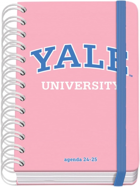 Dohe YALE Pink Lady Agenda escolar día página, los días de la semana ocupan un página excepto sábado y domingo que comparten hoja. La cubierta está fabricada en cartón forrado con papel impreso a todo color y plastificado brillo con puntas redondeadas. Guardas impresas. Una agenda con wire’o metálico de color blanco y cierre con goma elástica plana en color azul.