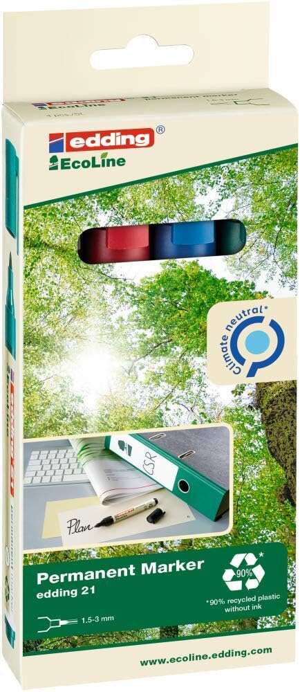 Edding 21 EcoLine Pack de 4 Rotuladores Permanentes – Punta Redonda – Trazo entre 1.5 y 3mm – 90% de Plastico Reciclado – Colores Surtidos