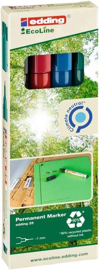 Edding 25 EcoLine Pack de 4 Rotuladores Permanentes – Punta Redonda Fina – Trazo 1mm – 90% de Plastico Reciclado – Colores Surtidos