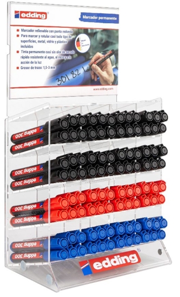 Edding 300 Expositor de 96 Rotuladores Permanentes – Punta Redonda – Trazo entre 1.5 y 3mm – Tinta Casi Inodora – Capuchon con Clip – Secado Rapido – Colores Negro, Azul y Rojo