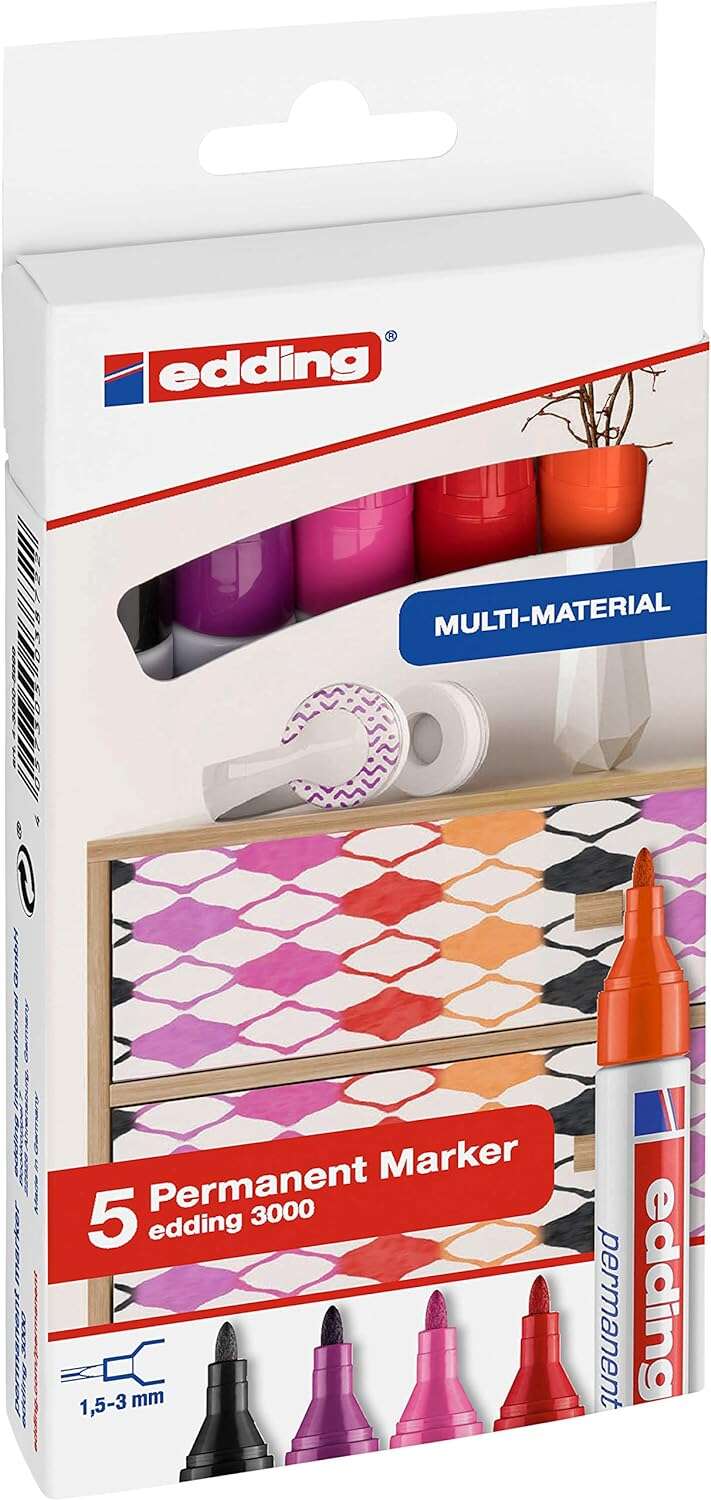 Edding 3000 Pack de 5 Rotuladores Permanentes Colores Calidos – Punta Redonda de 1.5mm – Trazo entre 1.5 y 3mm – Recargable – Secado Rapido – Colores Surtidos