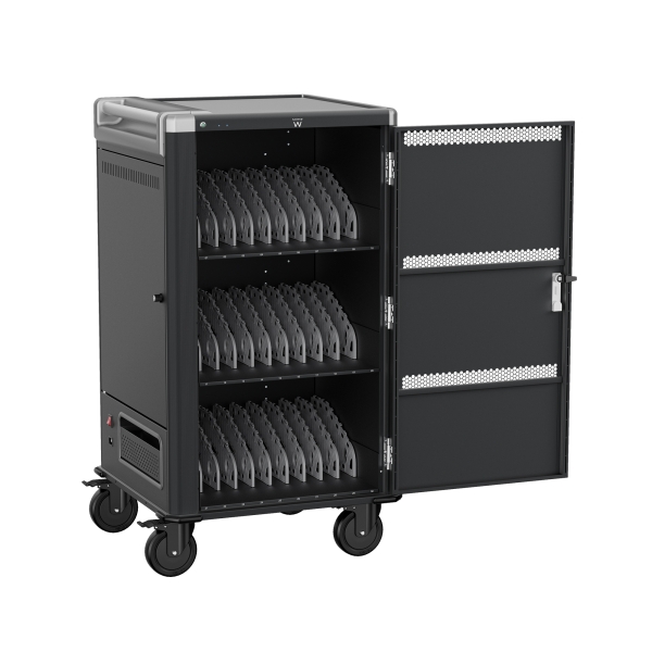 El carro de carga EW1700 le permite proteger, almacenar y cargar fácilmente hasta 30 dispositivos Tablets, Chromebook o portátiles con pantallas de hasta 17. Cuenta con un sistema de carga inteligente, estantes con ranuras para dispositivos flexibles y duraderas, un sistema de administración de cables/fuente de alimentación y, lo mejor de todo, está completamente ensamblado para una implementación rápida. Además, cuenta con espacios numerados para dispositivos y sus correspondientes espacios para suministro de energía para optimizar la organización. El carro también cuenta con puertas ventiladas con un mecanismo de bloqueo con llave de 3 puntos y la opción de agregar su propio candado para mayor seguridad.