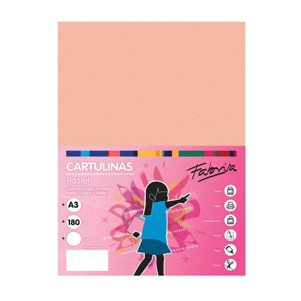 Cartulina de 180 g/m² tamaño A3. Cada pack contiene 25 cartulinas, tintadas en masa, ofreciendo así unos colores más homogéneos y nítidos. Ideal para su uso escolar, todo tipo de manualidades, cubiertas, separadores, impresión de documento, etc.