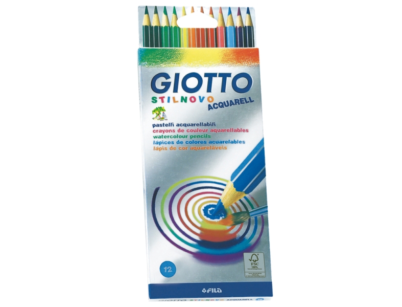 GIOTTO Stilnovo Acquarell Lápiz de color hexagonal, pintado del mismo color que la mina con bordes y el botón plateado. Mina acuarelable de 3.3 mm. Colores ricos e intensos que se diluyen perfectamente y fácilmente al contacto con el agua. Longitud 18 cm. Elaborado con madera certificada, recurso renovable.