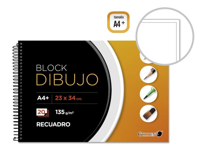 Golden Cuaderno de Dibujo A4+ con 20 Hojas – Papel de 135gr – Recuadro Interior Tamaño A4