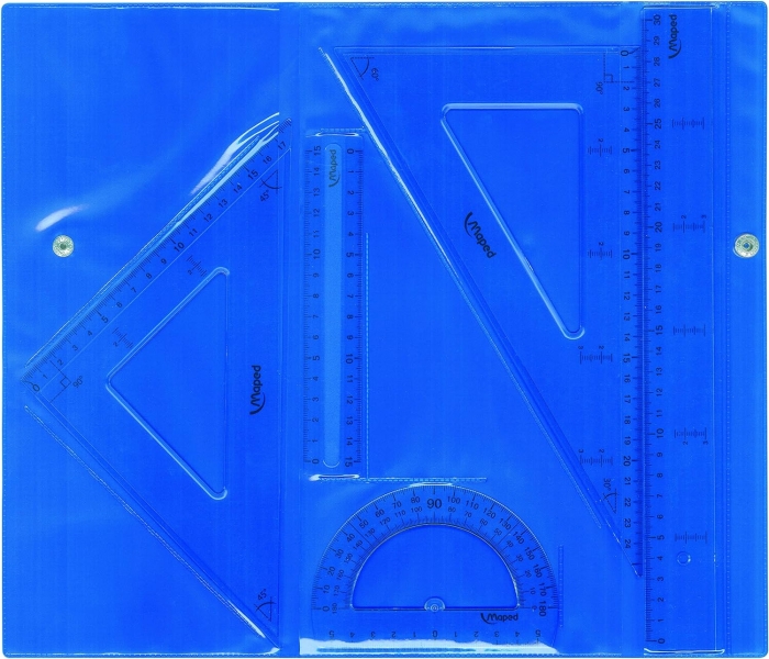 Maped Pack de Instrumentos de Dibujo – Regla de 30cm, Regla de 15cm, Escuadra, Cartabon y Transportador – Estuche con Cierre en Colores Surtidos – Transparentes