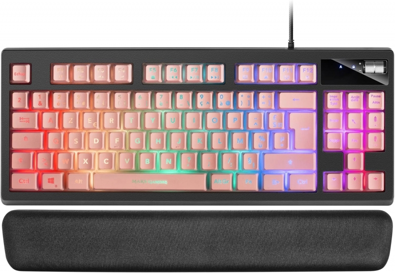 El teclado gaming MKAX de Mars Gaming ofrece todo lo que necesitas en un formato compacto y con un diseño espectacular. Disponible en tres versiones con acabados en negro, blanco y rosa, está equipado con una potente iluminación RGB Control que ofrece hasta 9 efectos y una pulsación híbrida totalmente precisa.