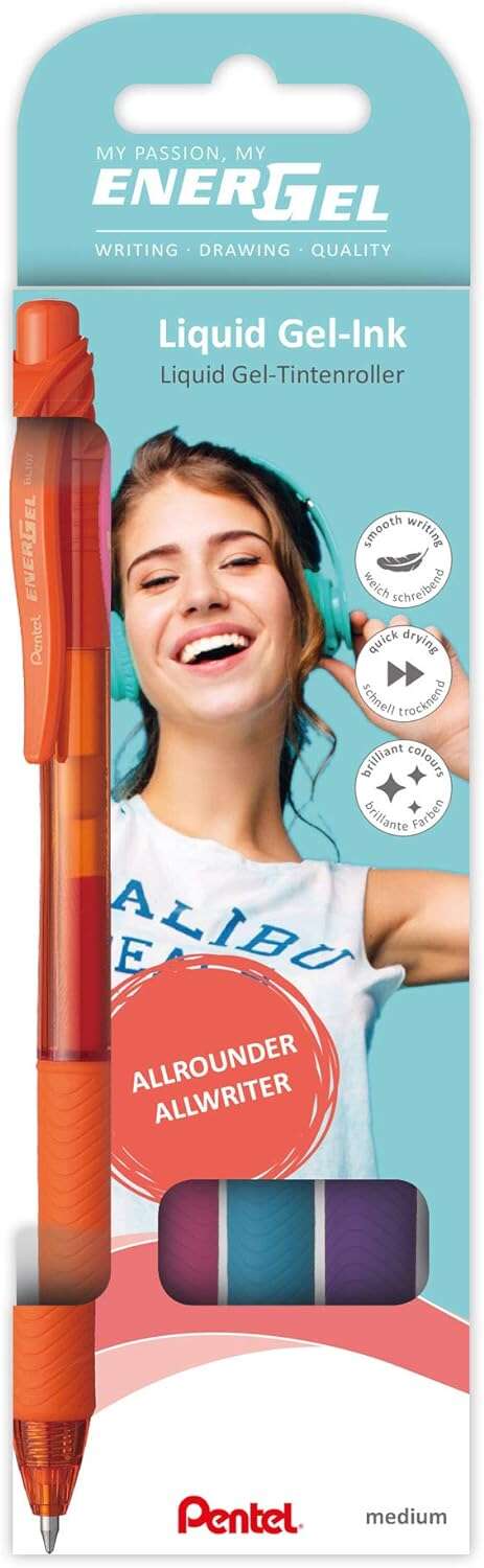 Pentel EnerGel X Pack de 4 Boligrafos de Bola Retractiles Tinta Gel – Punta 0.7mm – Trazo 0.35mm – Recargable – Grip de Agarre – 50% de Materiales Reciclados – Colores Fantasia Surtidos