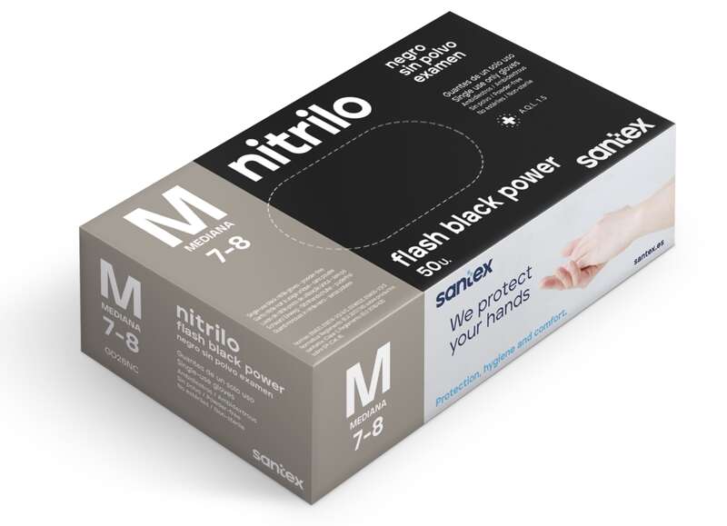 Santex Flash Black Power Pack de 50 Guantes de Nitrilo Talla M – Dibujo Diamante Texturizado – Sin Polvo – Libre de Latex – No Esteriles – Color Negro